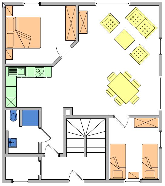 Kajüte 1 - Hauptdeck VorschiffDie Kajüte 1 verfügt auf 72 m² über 4 (bzw maximal 6 + Babybett) Schlafplätze. Die zum Teil mit Landhausmöbel eingerichtete Ferienwohnung befindet sich im Erdgeschoss im vorderen zur Elbe gerichteten Teil der Strandkajüte. ![]()