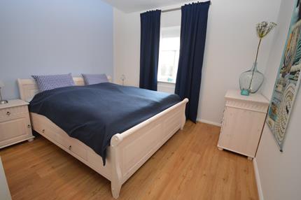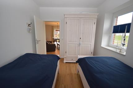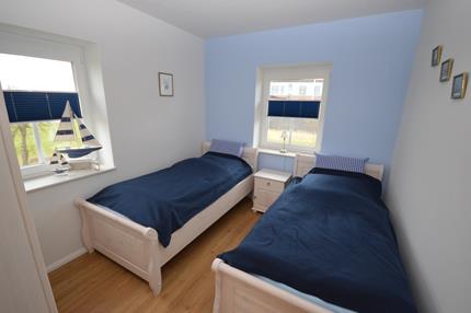 Doppelbett in dem anderen Schlafraum zwei breite Einzellbetten.